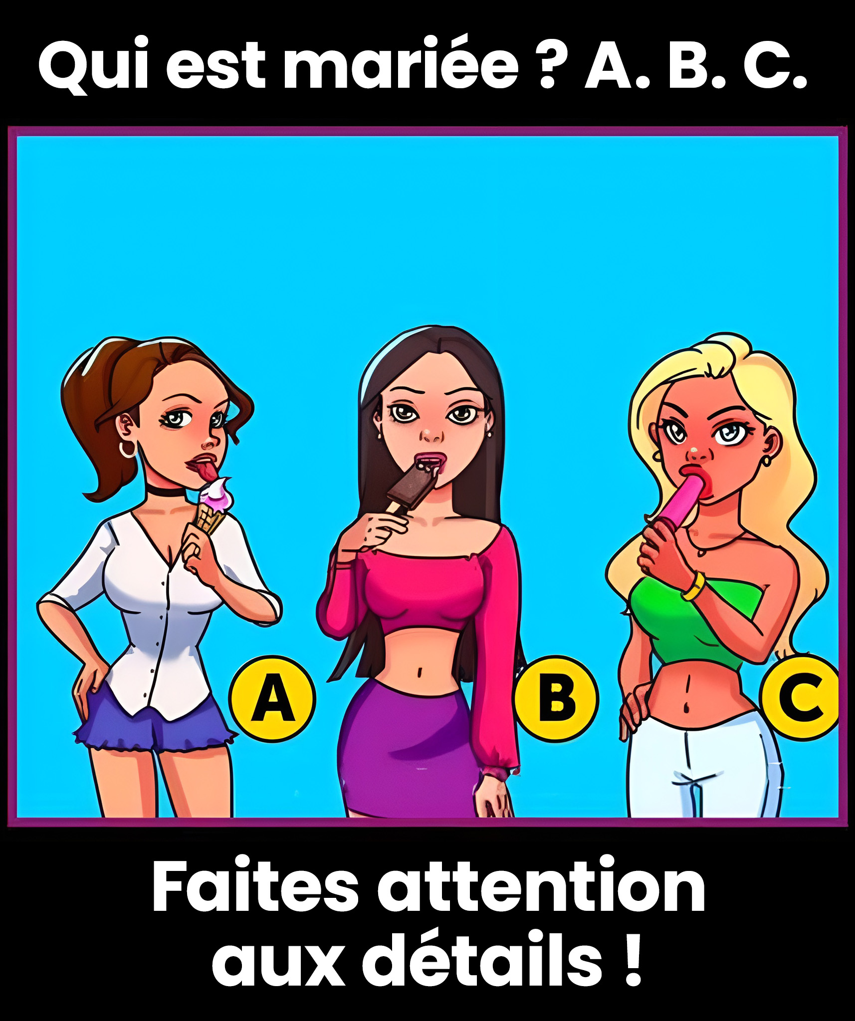 Vous avez percé le mystère ? Exact : il s’agit d’Élise. L’indice révélateur n’est ni sa jupe élégante ni sa coiffure étudiée, mais un fin anneau glissé à l’annulaire gauche (en France, c’est traditionnellement à ce doigt que se porte l’alliance de fiançailles). Ce cercle discret, modestement positionné, symbolise un engagement amoureux. Clara et Sophie arborent peut-être d’autres parures (bracelet, collier) ou des mains libres de tout bijou, mais aucune bague au doigt consacré. Ce qui rend ce test si ingénieux, c’est son dépouillement : une simple information, placée précisément là où le regard ne se porte pas spontanément, modifie toute l’interprétation. C’est le principe du « détail qui tue » au cinéma : fugace, subtil, mais qui marque les esprits une fois découvert.