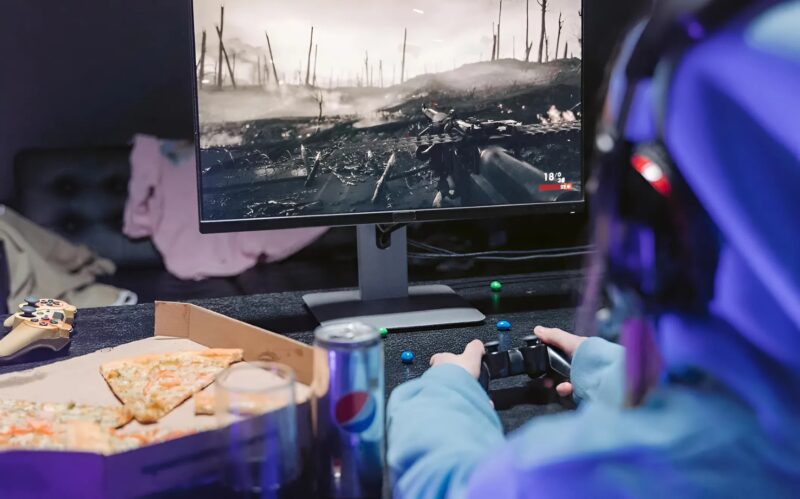 Alors que je m’apprêtais à repartir, un son différent a attiré mon attention depuis le séjour. Je m’y suis rendue et j’ai trouvé Julien, installé confortablement sur le canapé, avec des écouteurs sur les oreilles et une manette de jeu vidéo entre les mains.