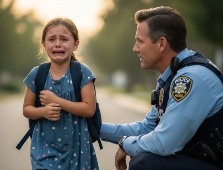 Après avoir parcouru plusieurs rues, elle distingue enfin deux policiers effectuant leur tournée de surveillance. Sans la moindre hésitation, elle se dirige résolument vers eux. Le gradé perçoit instantanément sa condition : cette enfant solitaire et visiblement éprouvée n’est pas là par simple curiosité. Il s’avance avec délicatesse, mais la fillette fond en larmes et se blottit contre lui.